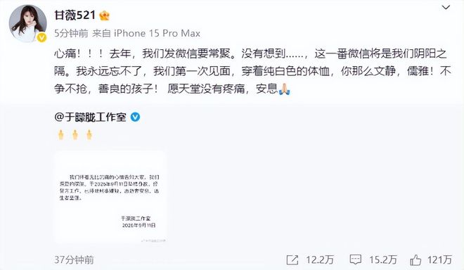 于朦胧去世的消息也让圈内无数好友震惊难过,大家在看到工作室发布的讣告后,纷纷发声悼念。